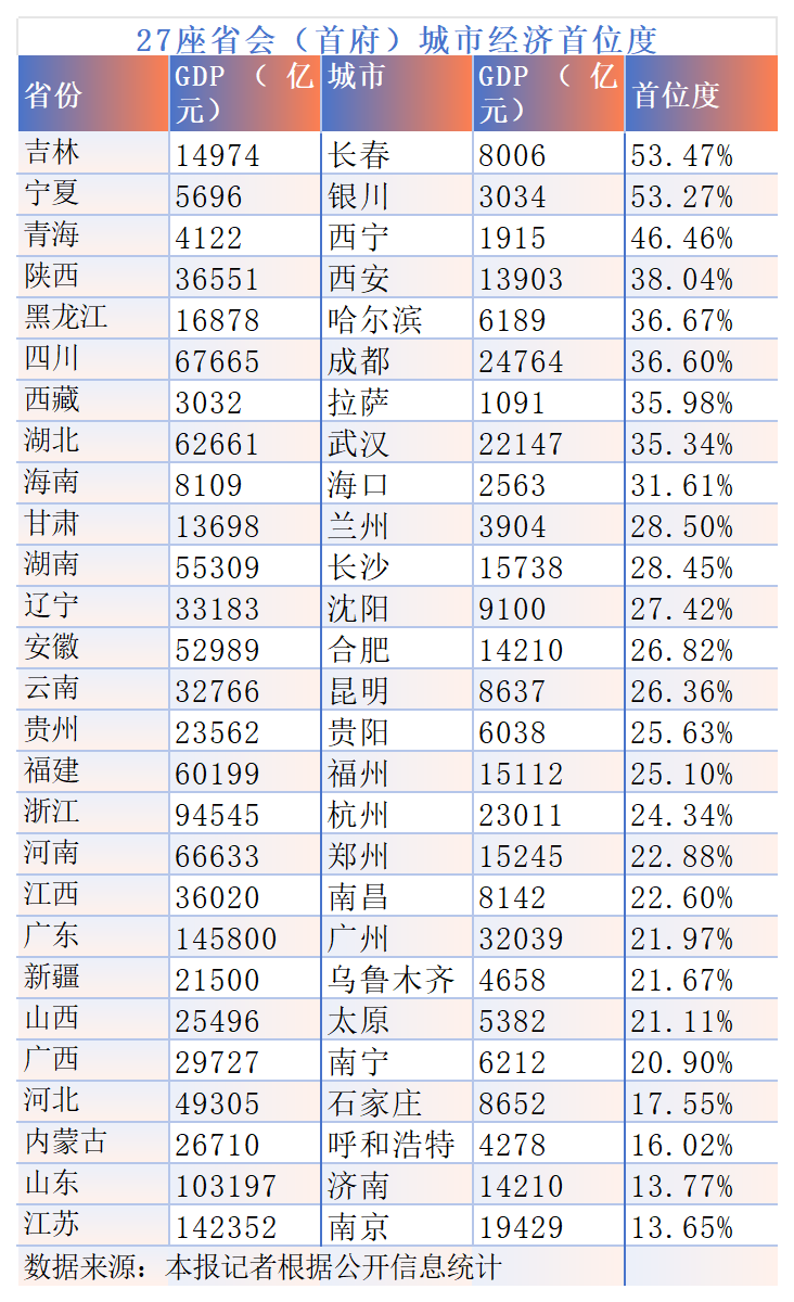 省会城市占全省GDP的比重,是衡量省会城市对本地区带动能力的重要指标,通常认为占比超30%则为强省会城市。