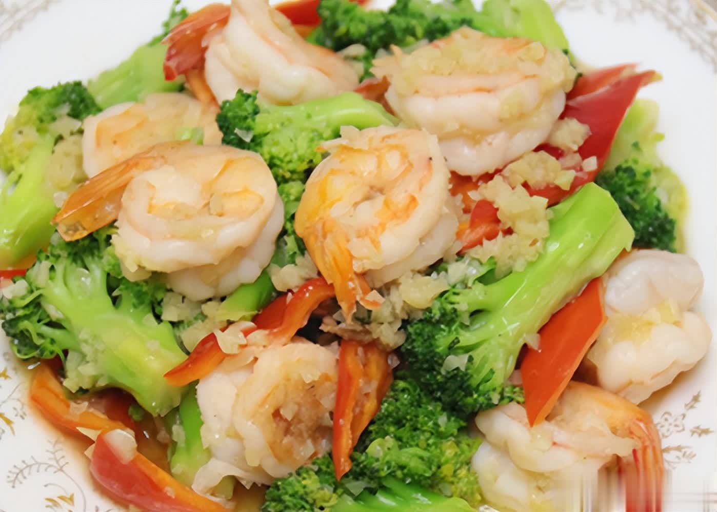烹饪步骤:西兰花焯水后切小朵,虾球用蒜末、橄榄油、盐和黑胡椒粉腌制后炒至熟透。