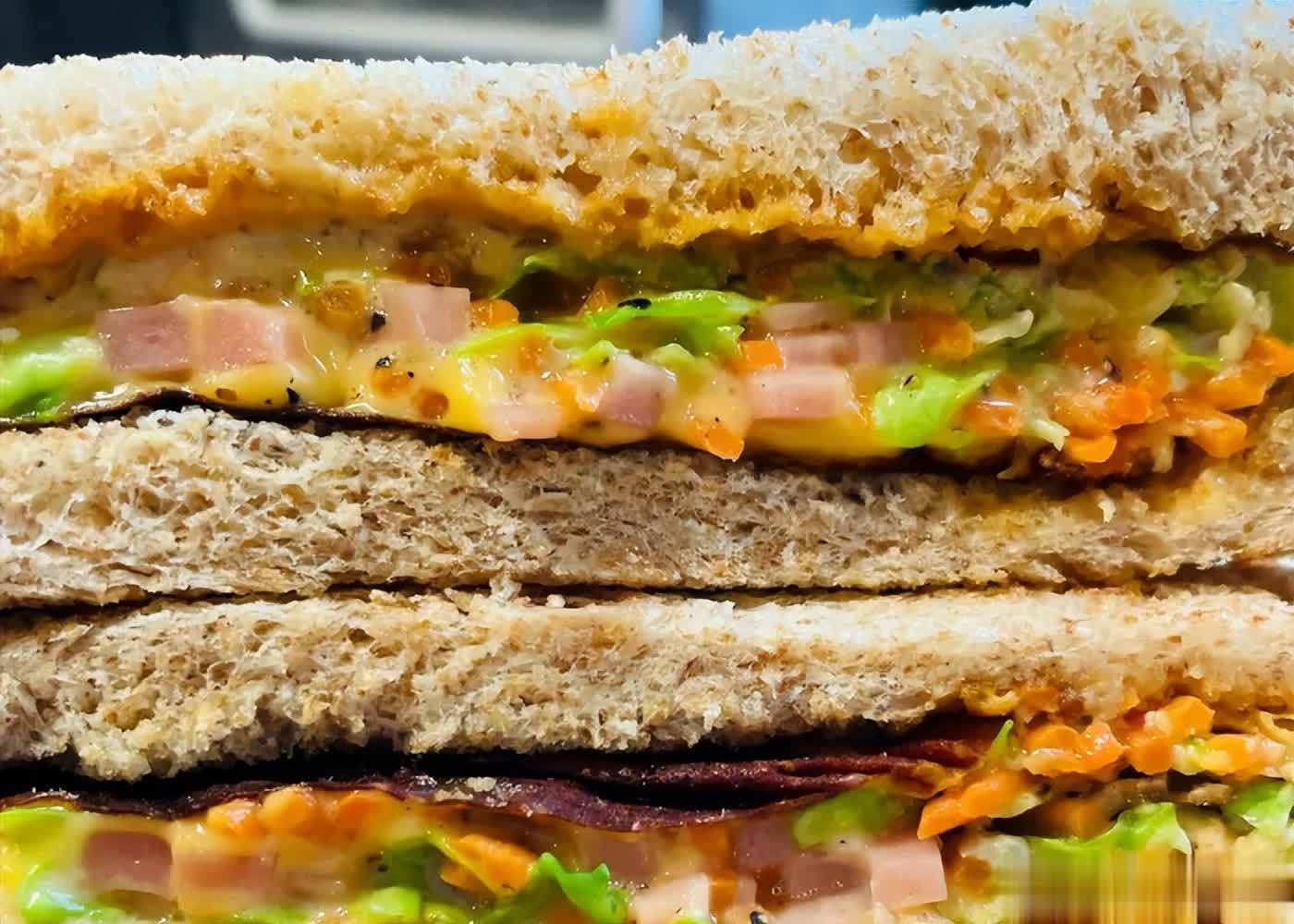 全麦面包三明治食材用量:全麦面包2片,鸡胸肉100克,生菜叶,番茄片,低脂蛋黄酱。
