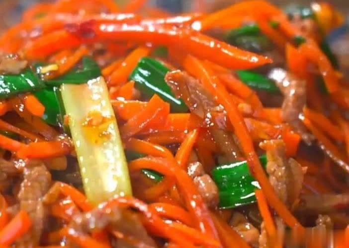烹饪步骤:胡萝卜切丝,牛肉丝用生姜和大蒜腌制后炒至变色,加入胡萝卜丝和酱油快炒。