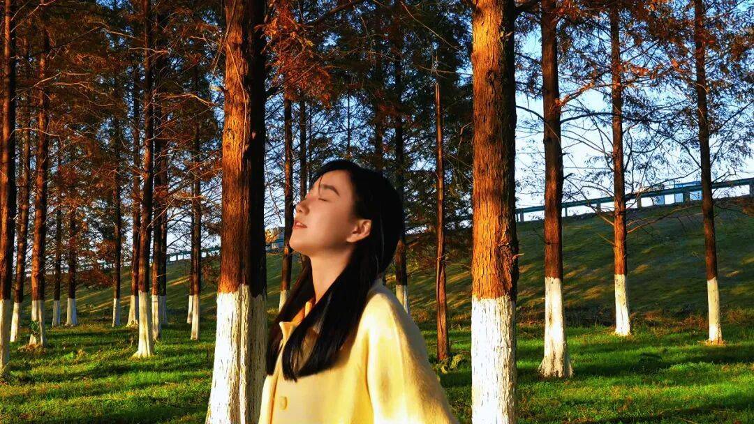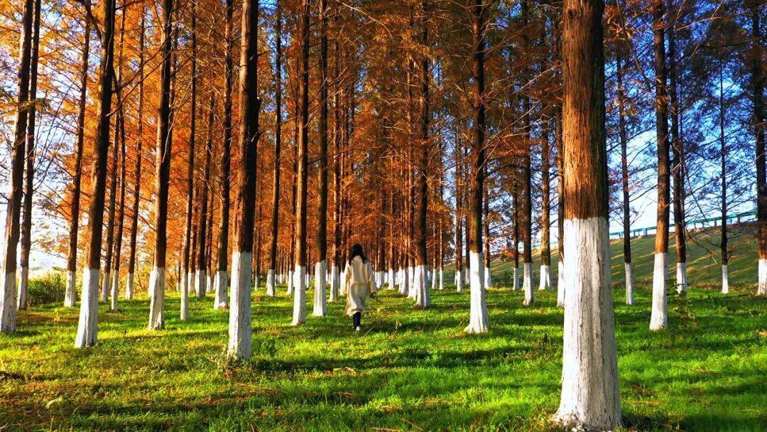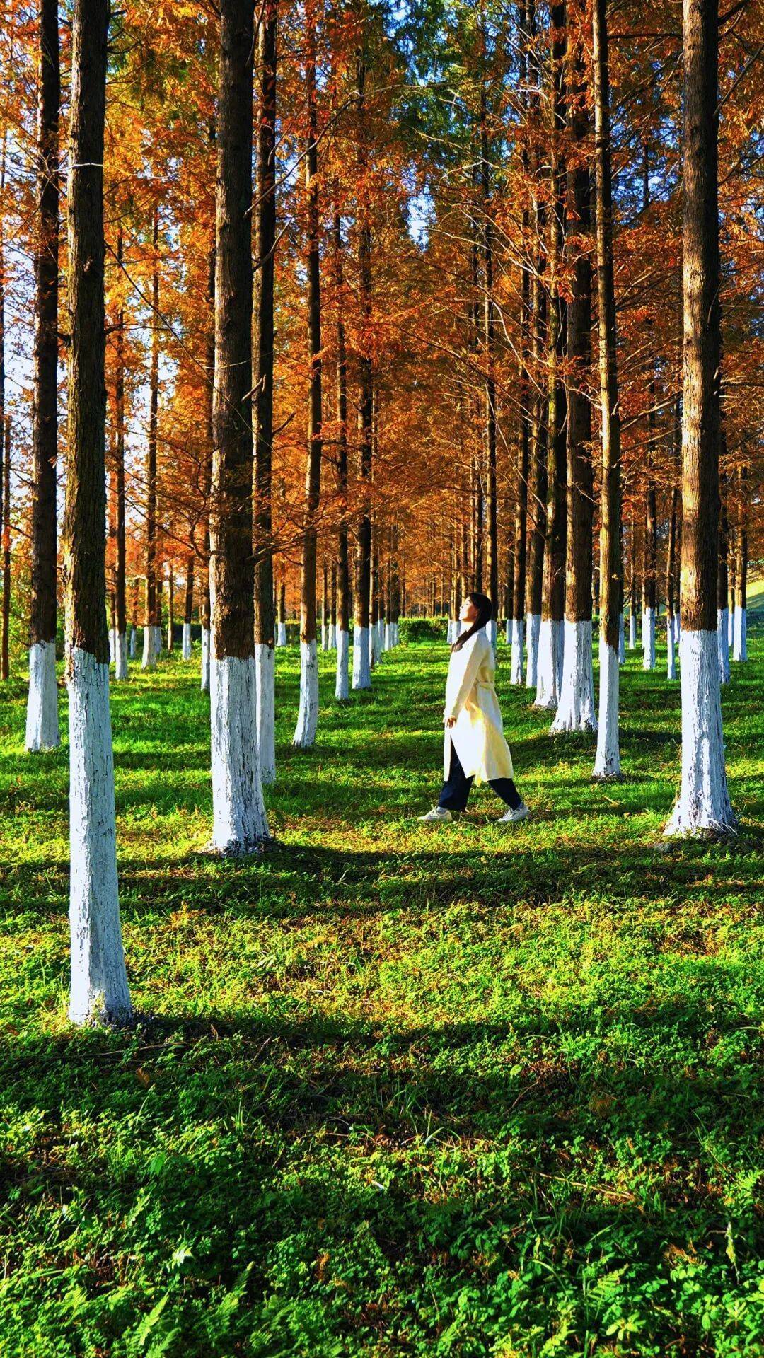 走进这片树林,仿佛闯入了现实版“童话森林”。高大的落羽杉褪去翠绿,从浅黄到深红层层递进,阳光透过枝叶的缝隙洒落,在地面投下斑驳的光影,踩在松软的落叶上,沙沙作响的声音都带着治愈感。林下的绿草地依旧生机盎然,与红叶形成鲜明对比,清新又亮眼,随手往树林里一站,不用刻意摆拍,就能定格浪漫瞬间。